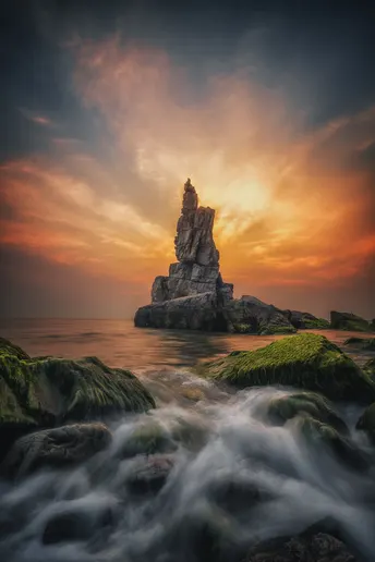 大连旅顺将军石,扫海晚霞一则,我在五月底独自来到大连风光拍摄,记录渤海湾这独特的海岸风貌,扫海摄影的魅力就是迎着大浪,记录海浪独一无二的形状。 📷a7m4 唯卓仕16f1.8 iso50 f11 1/4s