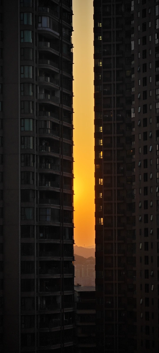 这幅作品是城市建筑与自然景观融合的摄影佳作 。两栋高层建筑如深色屏障,框出中间暖黄渐变的落日,建筑明暗对比凸显落日的柔和,营造出城市黄昏独特的静谧与壮美,展现人工建筑与自然光影碰撞的奇妙美学,传递出喧嚣都市中片刻的宁静诗意 。