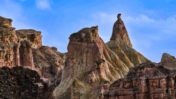 这张照片展现了张掖土林一片壮观的雅丹地貌景观。画面中,形态各异的土丘拔地而起,丘体表面沟壑纵横,纹理清晰,仿佛是岁月留下的深刻印记。土丘的颜色丰富多样,有棕褐、土黄等色调,在阳光的照射下,呈现出明暗对比,层次感十足。湛蓝的天空为背景,几朵白云点缀其中,更突显出土丘的雄浑与苍凉。