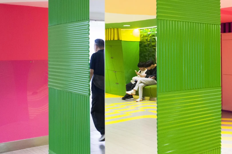 在商场的一隅,有一处别致的寄存处,宛如一个充满奇幻色彩的空间。墙面被巧妙地设计成彩色板与镜子相互间隔。彩色板以绚丽的色彩呈现,一块块排列开来,如同彩虹般绚丽斑斓,有明快的红粉色,带着阳光般的活力,活泼的嫩绿色,仿佛带着生机勃勃的春意。当顾客穿梭其间时,眼中看到的不再是单调的墙面,而是一幅幅色彩流转的画。镜面与彩色板相互映衬,让整个寄存处仿佛被一层梦幻的色彩包裹,这处小角落也成为了商场中一道独特的风景线。