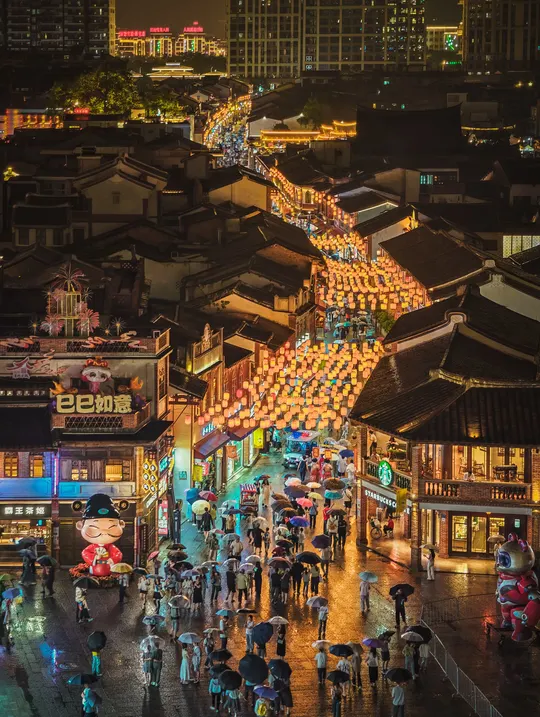 当行人撑伞漫步,古建筑与现代店铺交融,传统与现代在夜色中和谐共生,营造出一幅温馨而浪漫的画面。