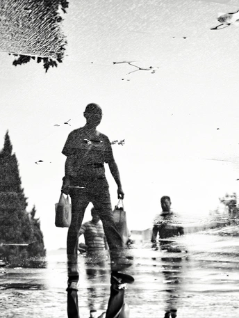 雨水汇聚成水洼映成倒影,如同现实与梦幻的交错,诉说着无声的故事。