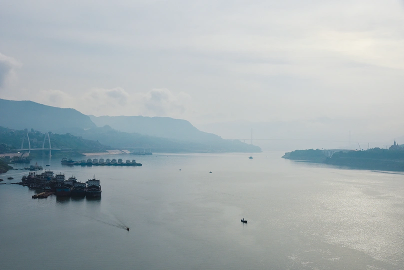 这是在长江重庆万州段的江面拍摄的。三峡工程将库区的水面变成了湖面,很平静。这是上午,太阳照耀下,水面波光粼粼。那些船都停泊在岸边,让这黄金水道显得有些冷清,而记忆中这江面应该是船来船往的。