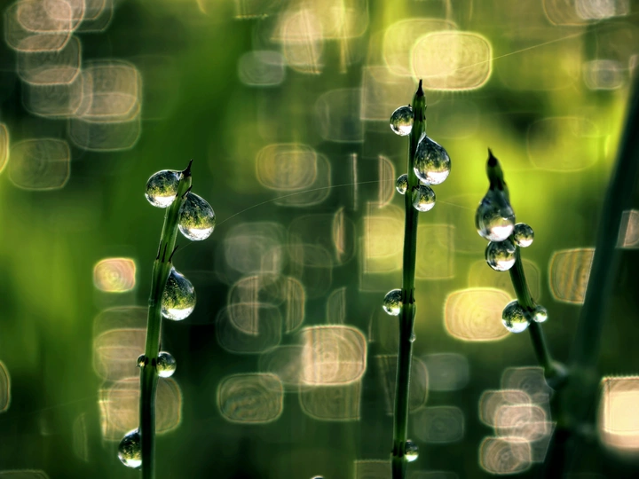 清晨的草尖缀着露珠,像星星碎落在人间。每一颗都藏着昨夜的梦,折射出整个温柔的世界,连阳光都忍不住来凑趣,在背后晕染成朦胧的画。