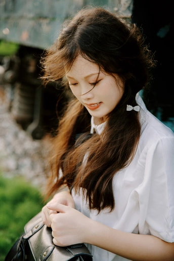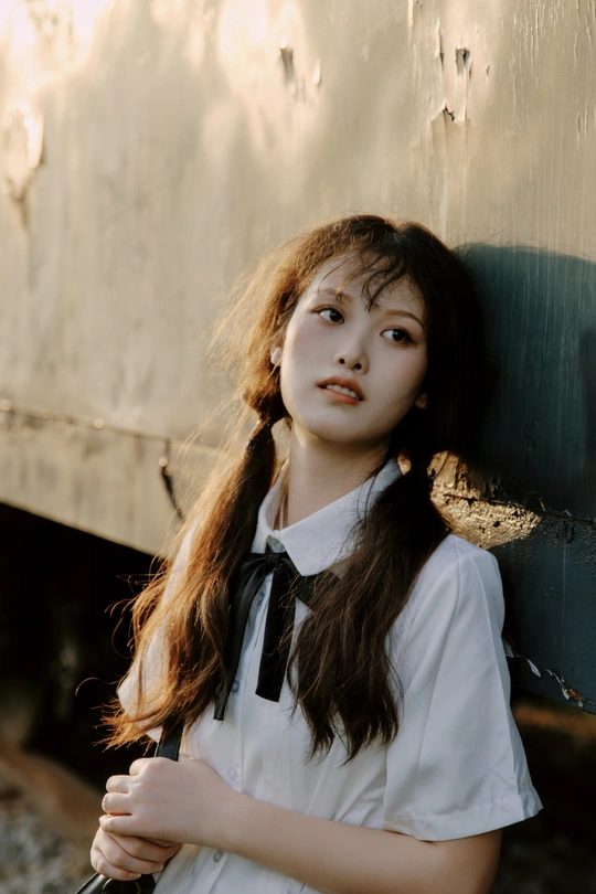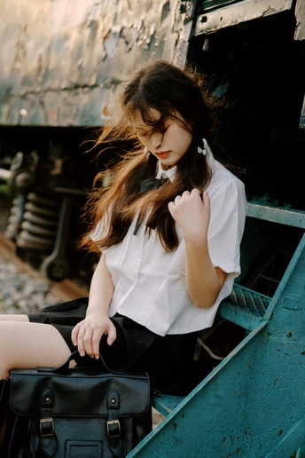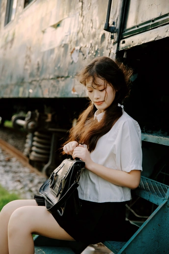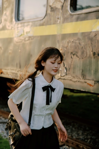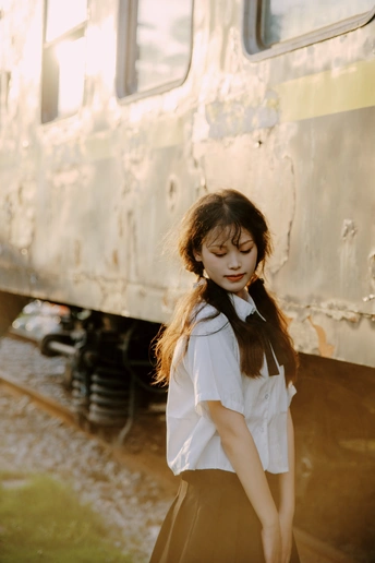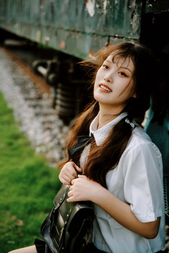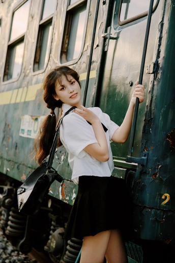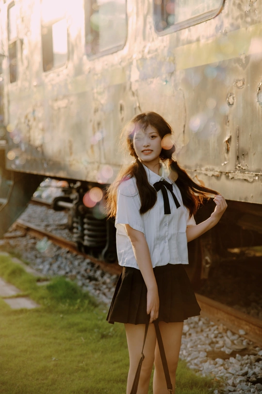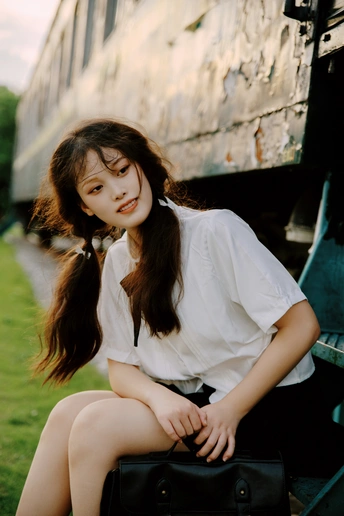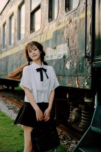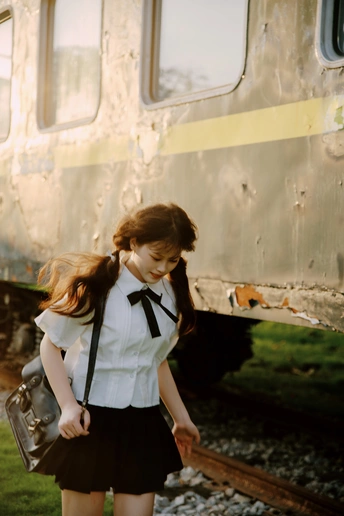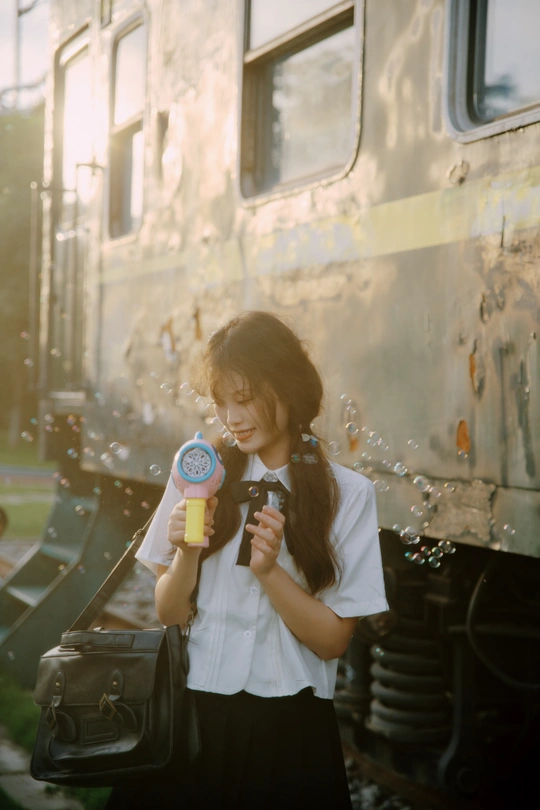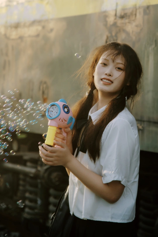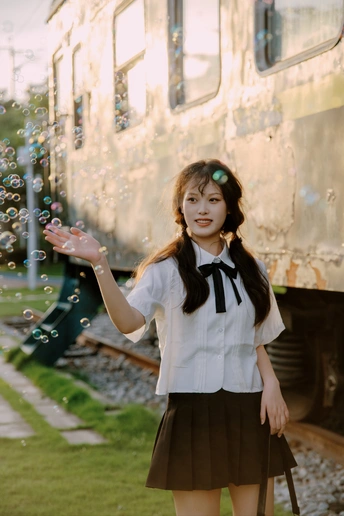 老火车锈得慢吞吞,我穿着白衬衫在边上晃。风扯头发,泡泡飘着飘着,突然懂了——青春就是这些没头没脑的瞬间,随便一帧都发光。
