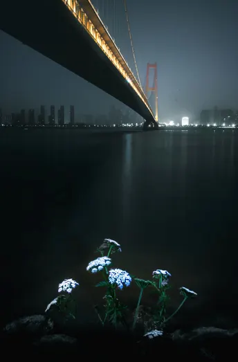 夜色如墨,桥是夜的脊梁,驮着暖黄灯火横跨江面,把城市的喧嚣轻轻抛在身后。江水像块巨大的黑绸,漫反射着桥的光,晕出朦胧的银边。而那些小花,是夜藏的秘密,幽蓝的花瓣沾着星子的光,在暗里静静开着,像给夜桥写情书的精灵。远处楼群的灯火是沉默的呼应,让桥的硬朗、花的柔软、夜的静谧,缠成解不开的 “夜桥花语”。风掠过江面,桥影轻轻晃,小花微微颤,仿佛能听见夜在说:这城市的喧嚣外,总有温柔的花,在桥边,把夜色吻成诗。