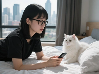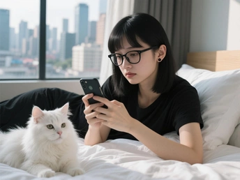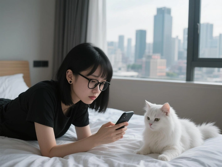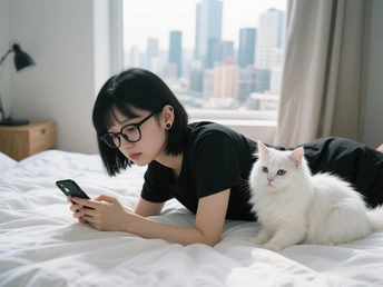 慵懒时光,黑衣女孩趴在床上玩手机,白猫陪伴左右