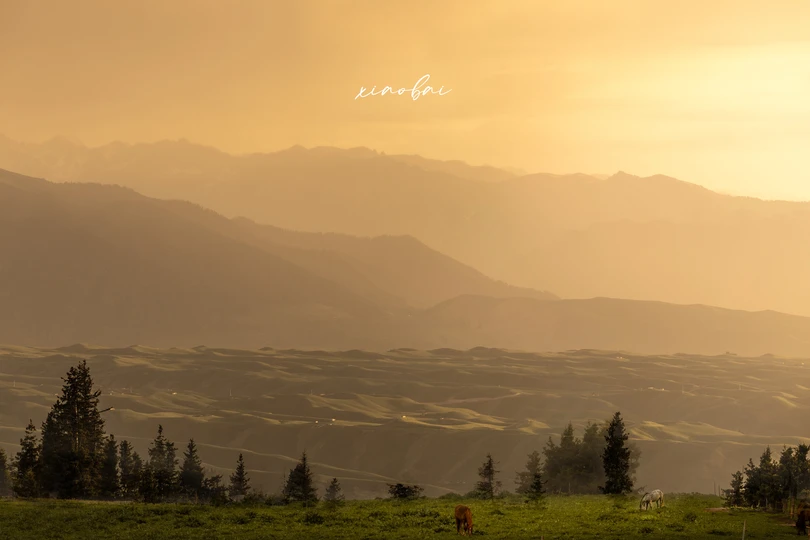 远处山峦层叠起伏,在温暖金色光线的浸润下,呈现出朦胧而丰富的层次,近处两只惬意的马儿在在啃食着青草