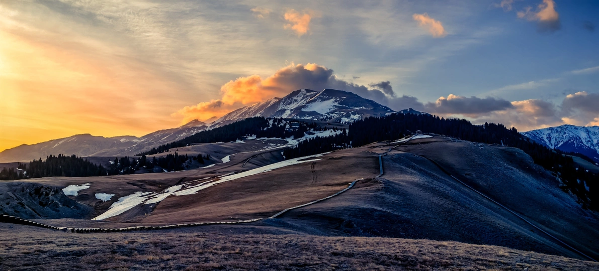 在果子沟大桥附近的露营地,拍摄了雪山上的日出,表现雪山日出时分令人叹为观止的美景和瞬间。