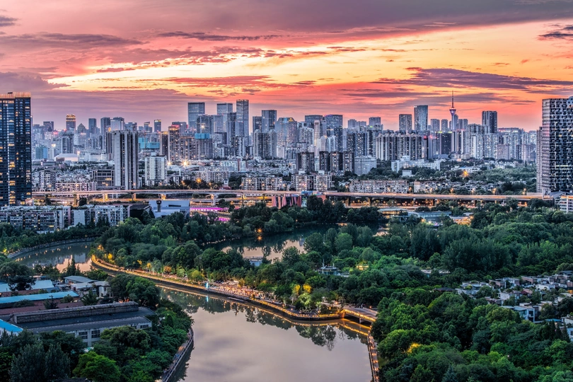 世纪晚霞下的成都天际线,彰显公园城市之美