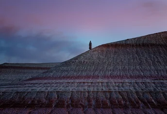 古海回声·孟古斯陶阿克陶山丘 哈萨克斯坦西部Mangystau(旧译“蒙古斯塔乌”)半岛上Aktau山丘(“白色山”“彩色地层山”)典型的沉积地质结构,Aktau山丘暴露出始新世—中新世湖泊与河流沉积的多色沉积岩,典型为红色/白色/蓝灰色粘土、石灰质沉积,厚度可达数百米,所在Mangystau区域属于Mangyshlak半岛,是北咸海—里海边缘的Ustyurt高原一部分,地壳在晚古生代—三叠纪经历板块碰撞与裂陷,沉积盆地厚度可达3–5 km for sedimentary layers.这些沉积物原为特提斯海/里海边缘的古海底或湖床沉积,呈现褶皱、分层,被风水共同侵蚀出独特地貌,干旱气候与风化作用下形成的沟壑与“陡崖”结构,彰显不同岩层硬度对侵蚀抗力的差异。 拍摄日期:2025年6月13日 相机 :Canon EOS R5m2