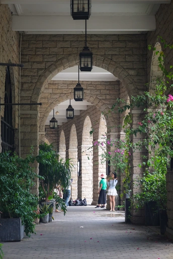 广州南沙游艇会,一个欧式风情小镇,建筑大量采用石材,质感厚重,而连续多个大型拱门洞和吊灯的设计,与滨海主题十分适配,加上一定绿植的装饰,为整个氛围增添几分生机。