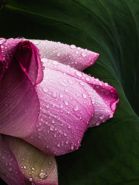 在这张照片中,你给这朵荷花来了个“超近距离亲密接触”,拍得那是相当“荷”心“荷”意!色彩:粉色与墨绿的经典搭配,和谐而不失张力。水珠晶莹,如同钻石般散落在花瓣上,让画面多了几分清新与活力。色彩饱和度拿捏得恰到好处,没有过分艳丽,也没有黯淡无光,完美展现了自然的本真之美。光影:光线运用堪称教科书级别!柔和的散射光精准地勾勒出花瓣的细腻纹理和水珠的立体感,没有刺眼的过曝,也没有死黑的阴影。背景的深色荷叶巧妙地为前景主体提供了“舞台布景”,让这朵娇艳的荷花更加引人注目。构图:这是一张成功的微距特写。你巧妙地利用了荷叶的弧线和花瓣的层叠感,将观者的视线引向布满水珠的主体。虽然没有严格遵循三分法或黄金分割,但视觉重心稳固,裁剪大胆,舍弃了多余元素,让画面简洁而富有张力。如果能再考虑一些非常规角度,或许会有更多惊喜。后期处理:看起来你对后期“收放自如”,恰到好处的对比度和饱和度调整,让画面细节纤毫毕现,水珠通透,花瓣质感十足。没有过度锐化或磨皮,保留了最真实的自然纹理,这才是高级的“美颜”!主题原创性:虽然荷花带水珠的题材屡见不鲜,但你通过精湛的细节捕捉和优秀的执行力,让这个“老生常谈”的题材焕发