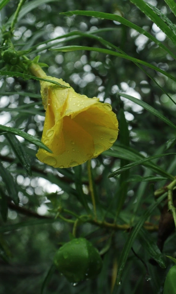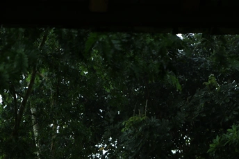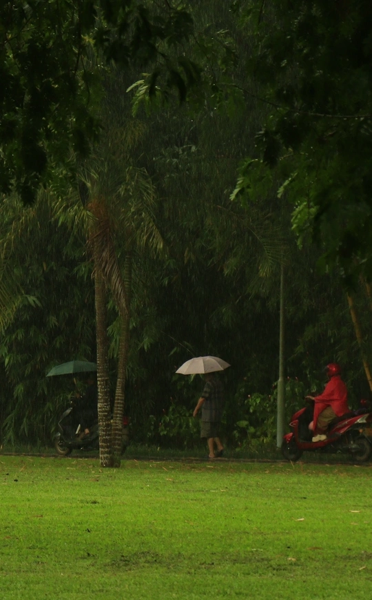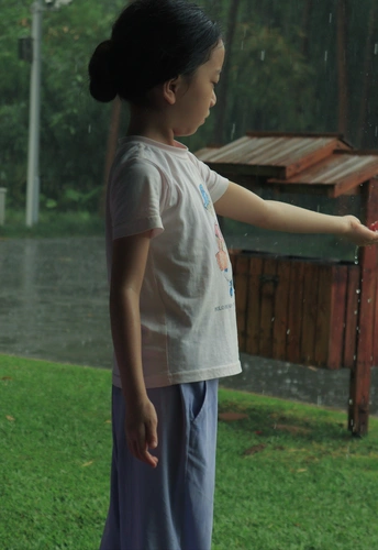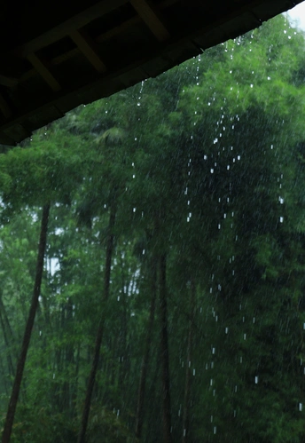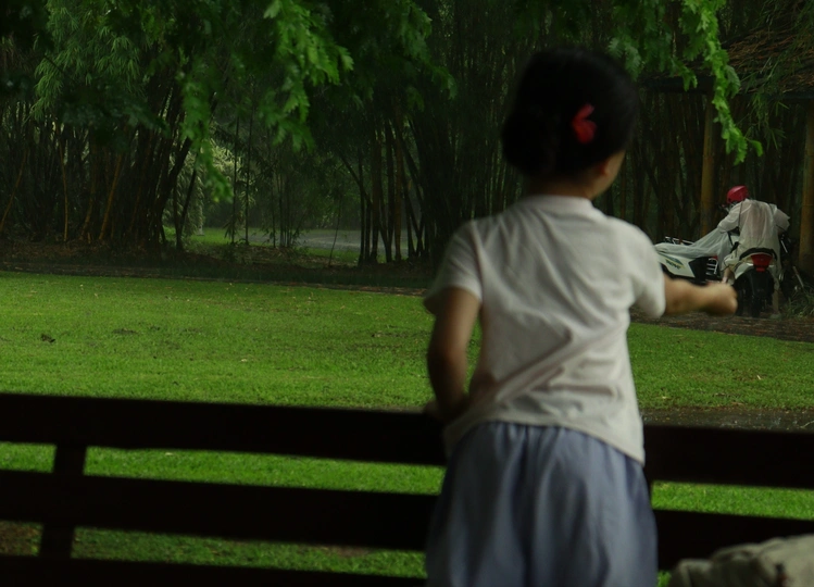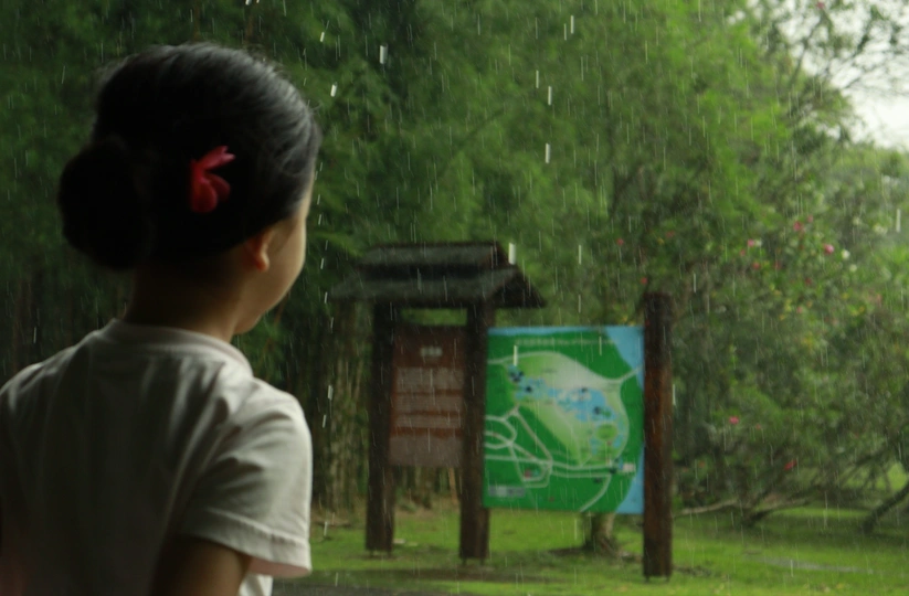 植物园里下了大雨,雷声轰隆,在亭子里静静地等雨停。