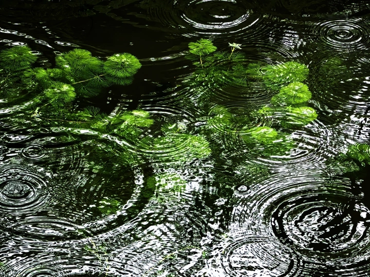 雨滴轻落,搅碎一汪静谧,圈圈涟漪漾开,似时光在水面书写的细密心事。水草如灵动的绿音符,在涟漪间浮沉,于幽暗底色里,晕染出清新的生机,把自然的温柔,藏进这方水的小世界 。