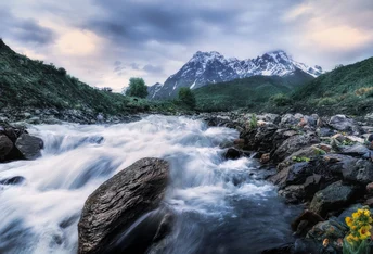 Rocky ridge of Mount Ushba showing behind the pine trees and the grassy slopes of the lower altitudinal zones of Caucasus Mountains. Svaneti, Georgia. 乌什巴山的岩石山脊,在松树后面,以及高加索山脉较低海拔区的草坡上。斯瓦涅季,格鲁吉亚。 来到梅斯蒂亚郁郁葱葱的山坡下,河流奔腾,远眺乌什巴群峰宛如山谷的威严守护者屹立于天际,冰川如冻结的瀑布般流向下方的苍翠林海。在晴朗的高山阳光下,雪峰散发出肃穆而宁静的灵气。
