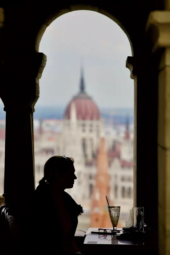 一位女士的剪影安静地坐在拱窗边。 窗外,城市的天际线中,布达佩斯议会大厦屹立在是阴沉的天空中。 拱形窗框如同画框,将沉思的人物剪影与恢弘的城市景观融为一体。深暗的色调中,流淌着一份独处的宁静与片刻的休憩。
