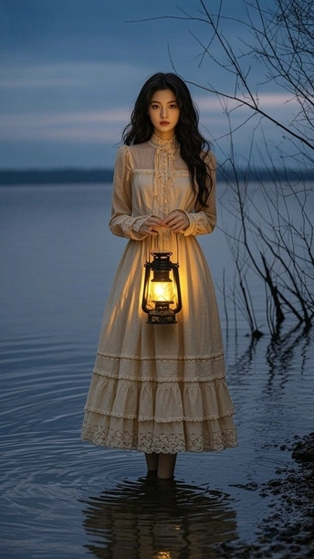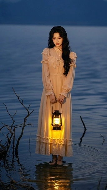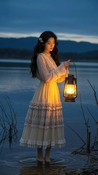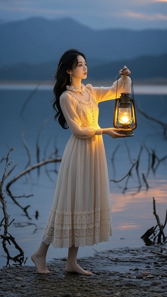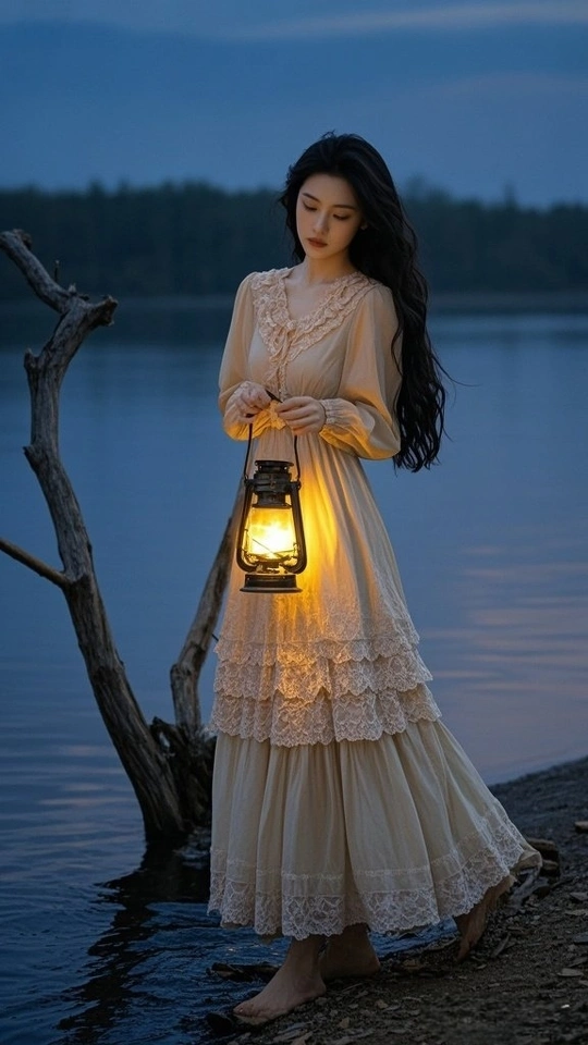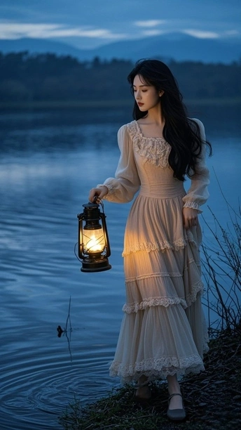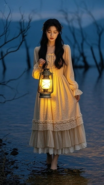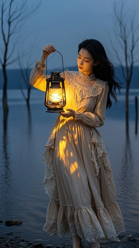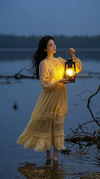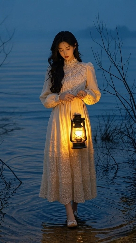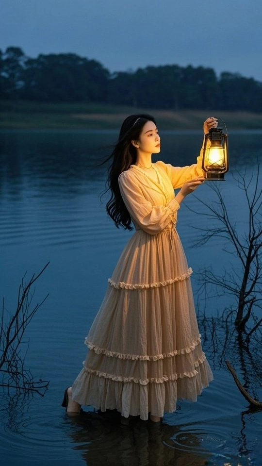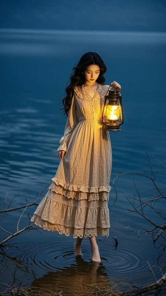 暮色漫过湖岸 灯盏舀起一捧星辉 裙裾裁碎银波 她在涟漪里打捞 被晚风吹散的 旧时光絮语 影子浸在水里 和水草纠缠成谜 灯芯轻颤 把孤寂 煨成暖黄的光 照亮自己的岛屿 不必问归期 不必说喧嚣 这一汪静谧 已把灵魂 轻轻包裹 在夜的褶皱里 听水与时光 低吟