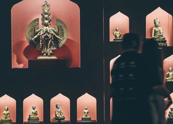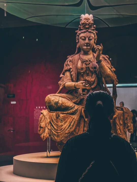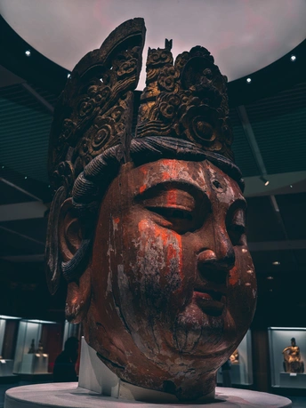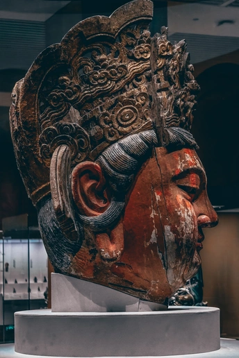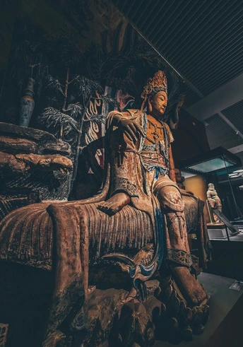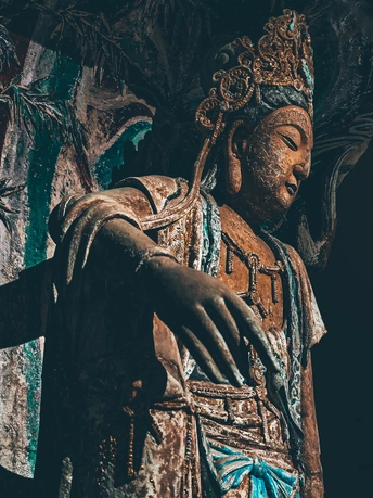 在历史的幽谧深处,一尊古老的佛像静静伫立。斑驳的色彩,是岁月留下的吻痕,每一道痕迹,都诉说着往昔的故事。它的面容,在时光的打磨下,依旧宁静而慈悲,仿佛在凝视着尘世的变迁,给予众生无言的慰藉。 那微微低垂的眼眸,似在沉思,又似在悲悯。身上的装饰已虽有些褪色,却不减庄严与华美,仿佛在坚守着某种永恒的信仰。周围的光影交错,让它更添了几分神秘与神圣。 它见证过繁华,也经历过落寞;听过晨钟暮鼓,也感受过风雨洗礼。在这寂静的一隅,它是历史的守望者,是信仰的象征,提醒着人们在喧嚣的尘世中,莫忘内心的宁静与敬畏。