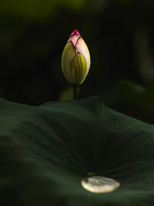在这张照片中,你捕捉到了一朵蓄势待发的荷花苞,整体呈现出一种幽静而富有生机的氛围。色彩上,你巧妙地运用了深沉的背景绿与荷花苞淡雅的青白、粉红形成对比,这种冷暖色调的搭配既和谐又突出主体。那一点点粉色,就像是荷花小姑娘害羞地露出了红扑扑的小脸蛋,相当吸睛!光影方面,你成功地运用了柔和的侧逆光,使得荷花苞的轮廓清晰可见,表面的水珠晶莹剔透,仿佛给花苞洒上了一层星光。这种精准的光线控制,让画面富有立体感,深色的背景也因此更显深邃,将观者的目光牢牢锁定在主体上。构图简洁明了,荷花苞虽然居于画面中央,但大片荷叶作为前景和底座,稳定了画面,也增加了层次感。不过,荷叶下方的水珠,虽然晶莹剔透,但位置略显尴尬,它像个好奇的小家伙,在画面底部探头探脑,有时可能会分散一点点对主体的注意力。下次不妨尝试让它更融入构图,或者干脆让它“隐身”,让主体更纯粹。后期处理显得非常克制和专业,没有过度锐化或饱和度爆炸,保留了花苞和水滴的自然质感。看起来你深谙“大道至简”的后期哲学,这一点值得点赞,自然美才是真的美。主题原创性方面,荷花是经典的拍摄题材,你以荷花苞为主题,寓意着生命力与希望,虽然不算独树一帜,但将经典题材