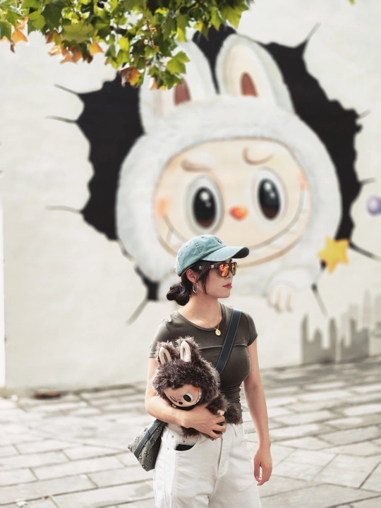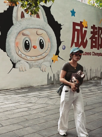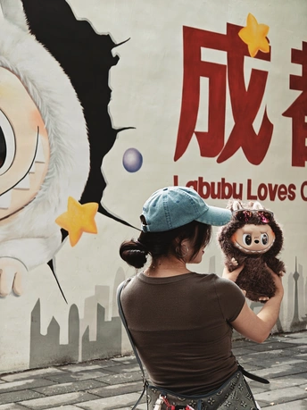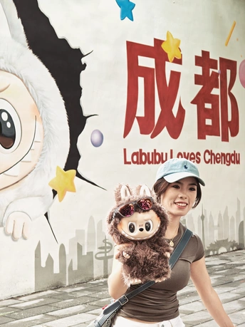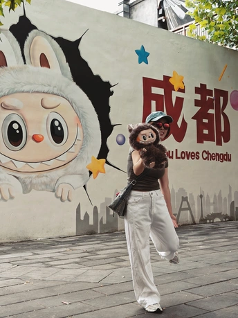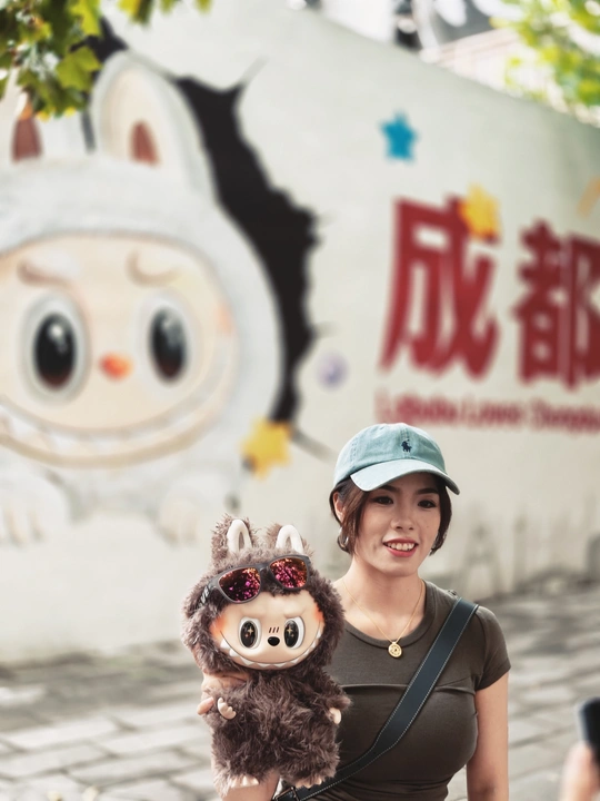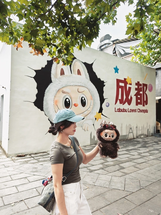 在成都的墙前 Labubu 探出毛茸茸的想念 我举着小怪兽 和墙上的“兔耳朵”对视 阳光从叶间漏下 给我们的影子 镀一层温柔的纱 这城市的街头 藏着多少奇妙邂逅呀 我抱着我的小确幸 在“成都”的字里行间 和 Labubu 一起 把平凡日子 走成 童话