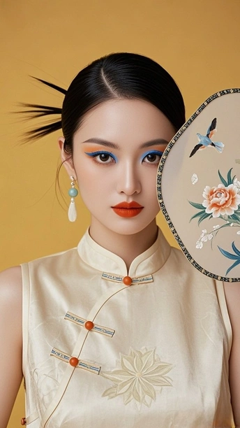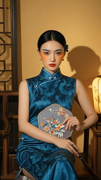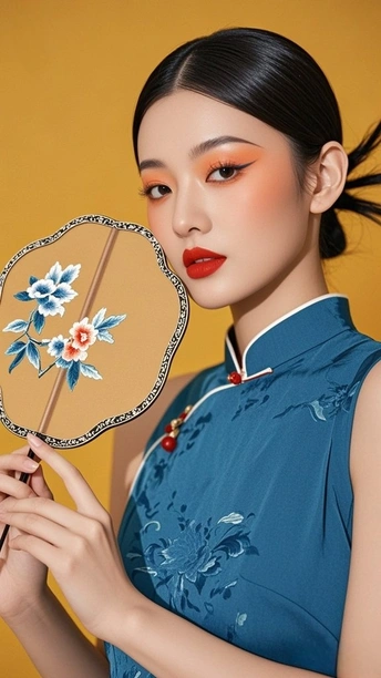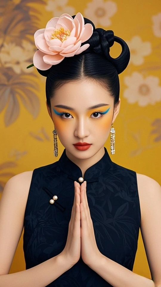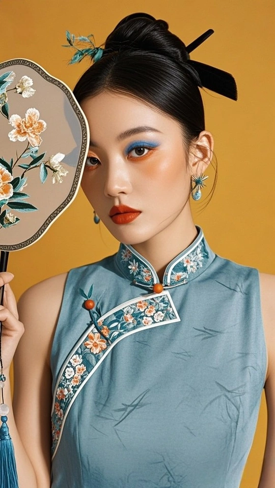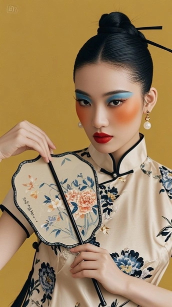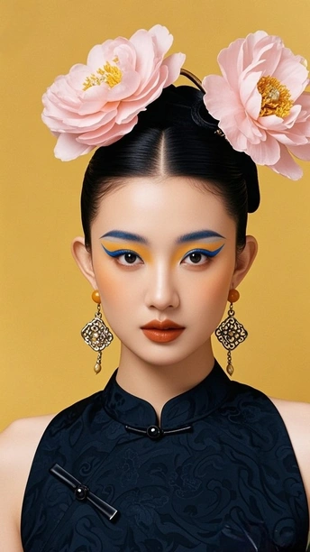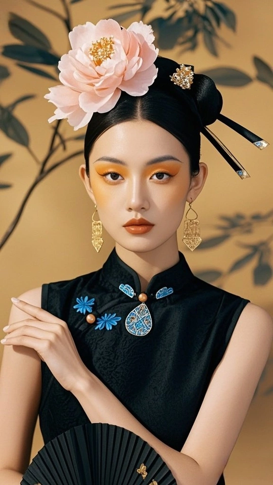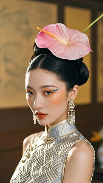 在时光的褶皱里 旗袍裁出东方的剪影 银线织就的纹路 是岁月哼着的古老歌谣 发髻如墨染的峰 托起那朵粉色的梦 像从旧画里逸出的花 绽在今世的晨昏 耳间的流苏轻晃 摇落一地细碎的光 眉眼间的蓝与橙 晕开东方美学的诗行 背景的朦胧 是历史的雾 而她 是雾中走出的 永不褪色的 东方符号