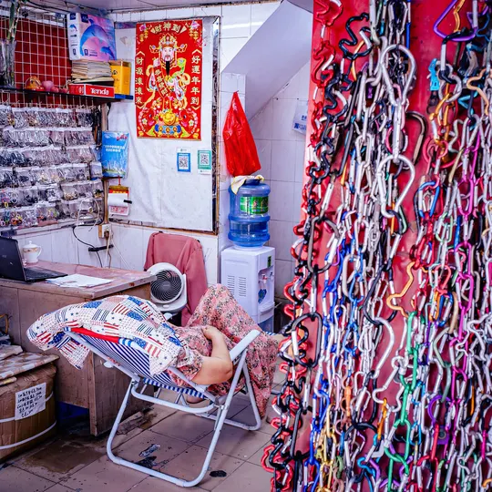 路过广州一德路的一间销售爬山扣等五金的小店,店主在蒙头睡觉,一点也不担心货物的安全。