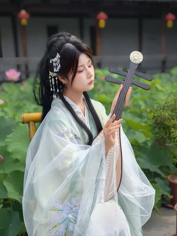 在济南安徽人家饭店前的荷塘前,拍摄了抚琴的古装女子,表现东方女子的婉约之美。