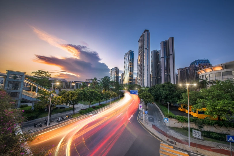 流动的光轨是城市跳动的脉搏,在昼夜交汇的温柔时分。