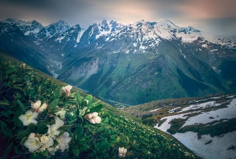 Mestia Heights: Rhododendron Blossoms beneath Ushba’s Glacier Realm 拍摄于Ushba Mountain Hiking Trails,格鲁吉亚西北部的斯瓦涅季高地乌什巴冰川景区,地处雄伟的高加索山脉之中,车子非常难开,小心翼翼。几多盛开的高山杜鹃洁白花瓣在清晨雾光中尤显宁静典雅;远处则是被称为“高加索的马特洪峰”的乌什巴峰,冰川披挂,巍峨峻拔。每年初夏,积雪初融,高山杜鹃竞相绽放,与山谷间流动的冰川交织成一幅生命与冰封并存的画卷。 这是6月1日到达这里时看到的杜鹃花,下车后又在高原徒步翻山越岭才找到,花还未全部开放,所以一周以后我们又来了一次,繁花盛开的片子还在移动硬盘里。#看世界##格鲁吉亚##佳能##live这一刻##与自己对话直到世界尽头#