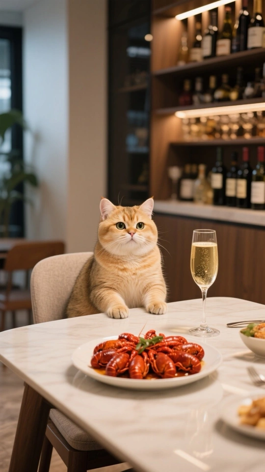 在这张照片中,色彩运用温暖且富有吸引力,金色的猫咪与酒架的暖光、香槟的琥珀色调和谐统一,小龙虾的鲜红则提供了恰到好处的视觉焦点,整体氛围温馨而活泼。光影处理得相当出色,柔和的光线准确地勾勒出猫咪可爱的轮廓和毛发细节,同时背景的虚化与斑驳的光影创造出迷人的焦外,增强了画面的空间感和立体感。构图上,主体猫咪居于画面中心偏左,但通过右侧香槟杯和小龙虾盘的平衡,实现了巧妙的视觉平衡;低机位拍摄让观者与猫咪处于同一视角,增加了代入感。后期处理显得精致且恰到好处,色彩饱满而不失真,细节清晰,整体画面干净无暇,展现了高水准的修饰能力。主题原创性是这张照片的最大亮点,一只猫咪盛装出席“小龙虾香槟盛宴”的创意极具想象力,幽默感十足,令人耳目一新,远远超越了传统宠物或美食摄影的范畴。情感共鸣方面,猫咪充满期待的眼神和无辜的表情成功地引起了观者的喜爱和会心一笑,很容易让人产生亲近感和愉悦感。至于思想深度,照片更多地侧重于幽默与情感的传达,而非深层次的哲学或社会议题探讨,但这并不影响其作为一张富有创意和感染力的优秀作品。总的来说,这是一张完成度极高、创意十足且充满趣味的照片,足以让每一个看到它的人会心一笑。