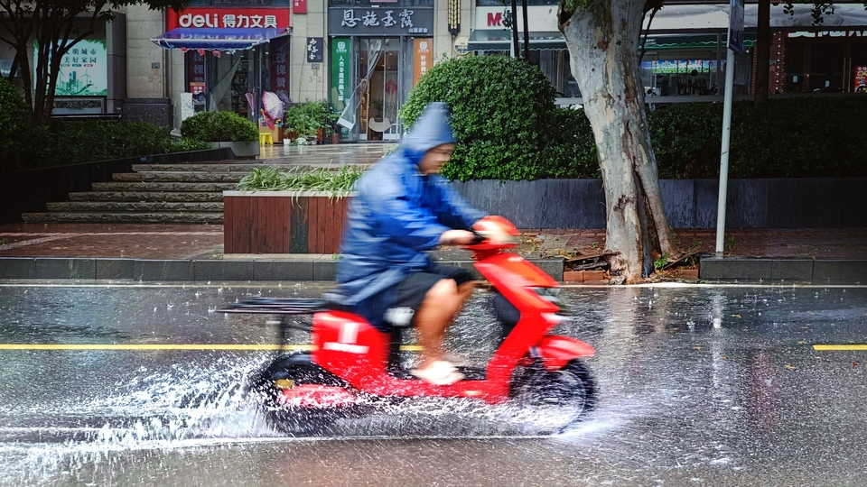 2025年6月21日拍摄于湖北省武汉市洪山区狮子山街珞狮北路。抓拍大风大雨纷飞下,街上风雨兼程外卖员走街串巷,信守承诺坚持送货。好似走雨穿风外卖员。