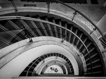 在济南的山东大厦,高机位俯拍了大堂里的旋转楼梯,表现空间层次感与线条之美。