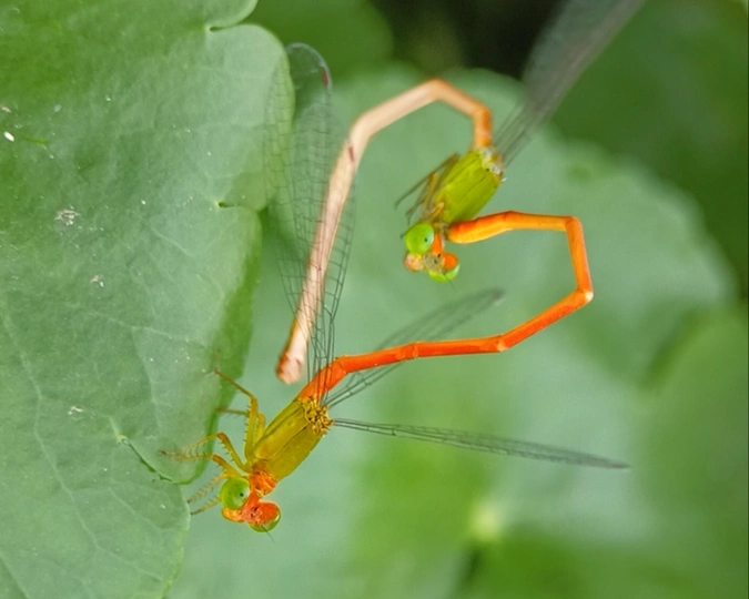 2025年6月18日晨拍摄于湖北省武汉市洪山区南湖。豆娘小夫妻在绿叶上嬉戏,突然配合默契双双摆个红爱心,好似一对情侣互爱表红心。