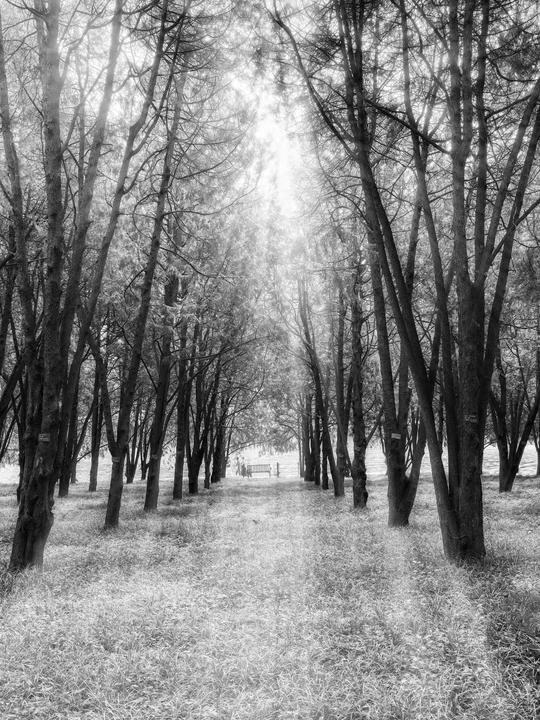 当我踏入这片如梦似幻的树林,仿佛走进了一个被尘世遗忘的仙境。高大笔直的树干犹如一群忠诚的守护者,它们井然有序地排列着,用坚实的身躯撑起了一片属于自然的浩瀚天空。阳光如同灵动的精灵,轻盈地穿梭于枝叶之间,从那细密的缝隙中洒下,在地面上勾勒出一片片斑驳陆离的光影,宛如岁月精心书写的神秘诗篇。脚下,细碎的草叶铺就了一条柔软而宁静的地毯,每迈出一步,都好似与时光进行着一场轻柔的对话。目光越过树林,远处的墙壁在朦胧的视线中若隐若现,奇妙的是,它远看竟宛如汹涌澎湃的海浪。那起伏的轮廓,仿佛是大海在某一瞬间被凝固,带着无尽的动感与力量。而在这墙壁不远处,一张长椅静静伫立着,像是一位温柔的倾听者,无声地邀请着每一个疲惫的灵魂前来栖息。我缓缓走向长椅,坐下,闭上双眼,让这林间的微风轻拂脸颊,让自然的低语填满耳朵。在这方纯净的天地里,外界的喧嚣被彻底隔绝,我的思绪如同一只自由的鸟儿,在往昔与未来的天空中肆意翱翔。心灵在这份宁静中得到了深度的净化与治愈,仿佛重新寻回了那份久违的安宁与平和。