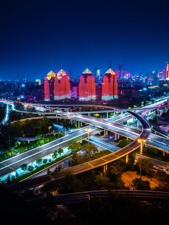 近处蜿蜒曲折的立交桥,和桥旁边的建筑群,在城市亮化工程下,自然形成一幅光的画卷。