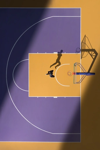 在上午阳光猛烈的篮球场,遇到独自练球的人,跳跃离地瞬间,地上的光影就像从罚球线上平飞着去扣篮。