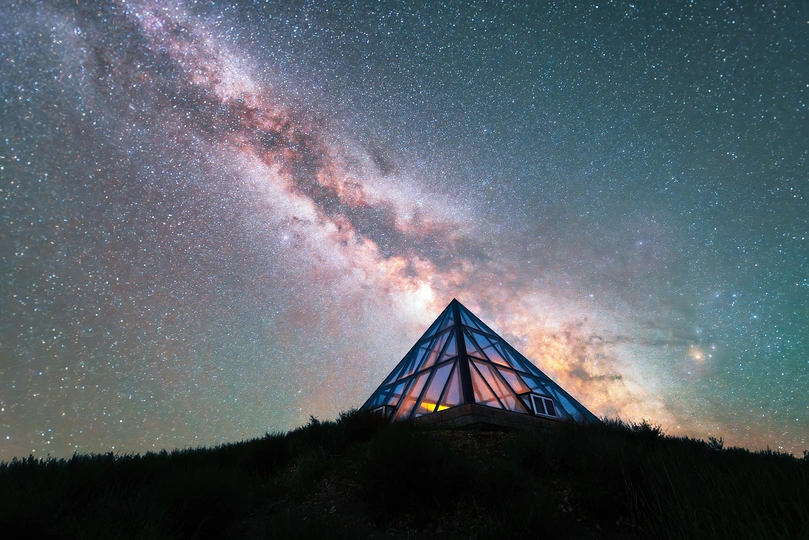 用一天时间穿越浑善达克沙地核心区,调头去了上都湖,今年雨水很好,整个正蓝旗的草场都很漂亮,牛羊壮美,适合一路航拍,连精简版的“卢浮宫”都显得很精神,我特意让队友拿着一盏暖色调小灯到玻璃房对面,在荒凉中涂抹出一丝温情。日落前,彩虹出现在玻璃房上,然后被突如其来的阵雨浇了一身,据说此时的北京也在下雨。不抱希望的一晚,却等来了星河满天,赶紧开车沿湖拍了一圈,白天的地景不能白踩。人生须臾,此时恰如彼时,精彩总在不经意间。#星空摄影 #银河 #旅行