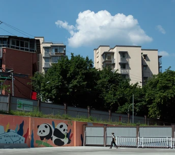2025年6月28日下午,当天最高气温37℃,我跟随外公,到重庆市九龙坡区黄桷坪廉洁艺术馆看展览,天气很热,天空飘来白云,地面广场上画有熊猫,有人走进时我拍了下来。