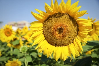 在这张照片中,向日葵的色彩鲜明饱满,黄色与蓝天的对比度恰到好处,营造出一种活力四射的氛围。捕捉了蜜蜂采蜜的瞬间,情感共鸣方面,照片传递了阳光、积极的情感。