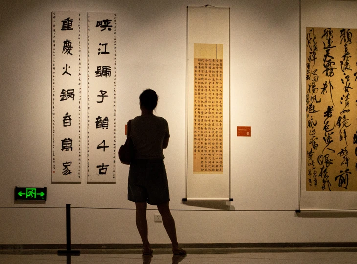2025年6月28日下午,我到重庆市九龙坡区黄桷坪四川美术学院老校园当代美术馆看展览,见一位妸姨在住足观看,仔细端详书法作品,条幅左联上写有“重庆火锅”几个字,就命名为“品味”。