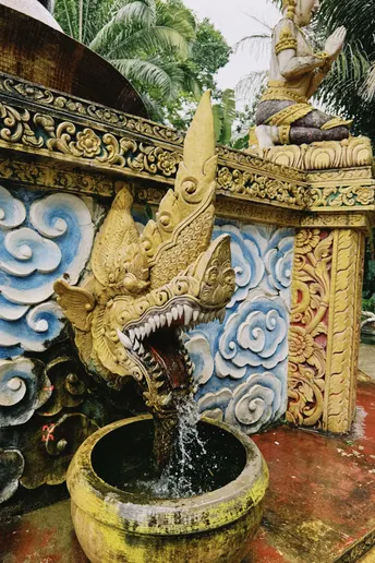 #曼听御花园 位于景洪市东南部,处于澜沧江与流沙河汇合的三角地带,是一座拥有1300多年历史的文化公园,前身是西双版纳傣王的御花园,傣族习惯称之为“春欢”,意为“灵魂之园”。 周恩来总理纪念铜像:位于公园正门入口约50米处,铜像基座占地面积374平方米,记录着1961年周总理来此参加泼水节的美好回忆。