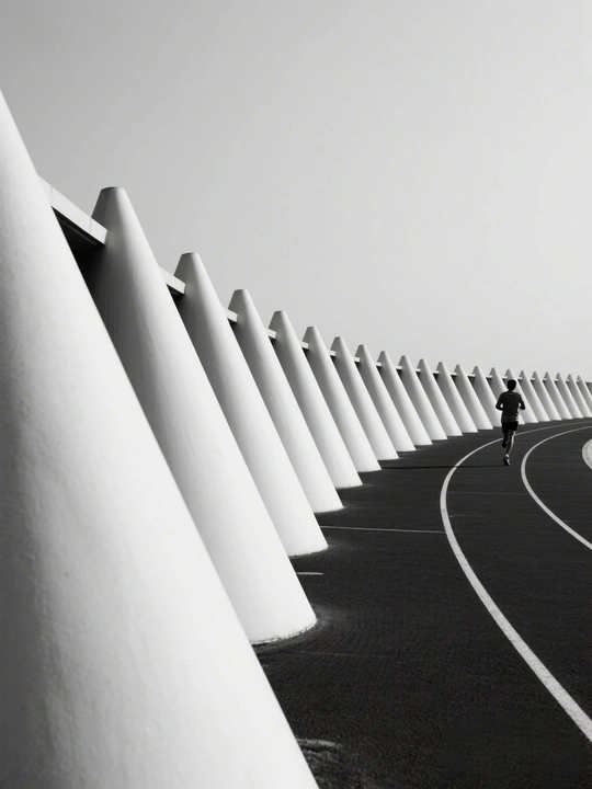 在这张黑白摄影作品中,摄影师巧妙地利用了重复出现的柱状结构创造出强烈的视觉引导线,将观者的目光引向画面右侧奔跑的人物,构图简洁而富有张力。色彩方面,黑白影调的使用强化了画面的几何感和形式感,同时突出了光影的对比,让柱子的轮廓更加鲜明。光线的运用整体均匀,但柱子之间细微的光影变化为画面增添了层次感。构图上,柱子的排列遵循了一定的透视规律,形成了汇聚的效果,但人物的位置略显靠右,如果稍微偏左一些,或许能更好地平衡画面。后期处理方面,影调控制得当,黑白对比适中,没有明显的噪点或过度锐化。主题的原创性在于将运动与建筑结构相结合,呈现出一种动与静的对比,具有一定的艺术性。情感共鸣方面,奔跑的人物传递出一种积极向上的力量,能够引发观者对运动和生命的思考。思想深度上,作品可能暗示着个体在既定结构中的运动和突破,具有一定的象征意义。改进建议:可以尝试调整人物的位置,或者改变拍摄角度,以获得更完美的构图。此外,可以适当增加画面的对比度,使光影效果更具戏剧性。