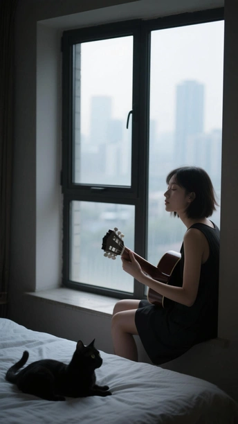 阴雨天女孩坐在窗台弹着吉他,陪伴她的只有黑猫
