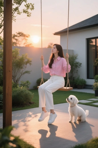 夕阳西下,小姐姐悠闲的荡着秋千,狗子陪伴着她