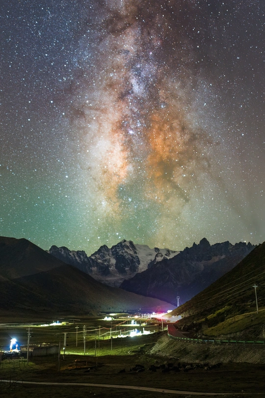 沿317国道走近有川藏第一险之称的雀儿山,拍下这张绚丽银河气辉与雪山冰川相映衬的画面