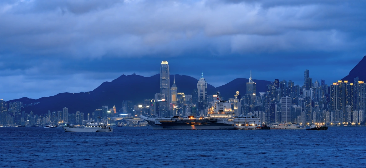 《蓝调时刻》山东舰航母与维多利亚港合影