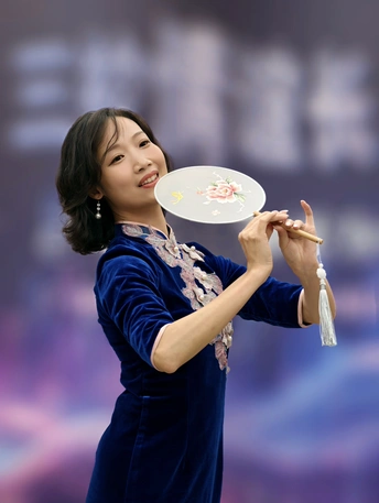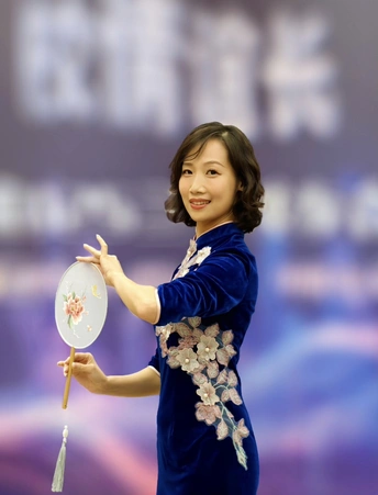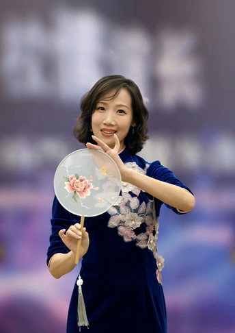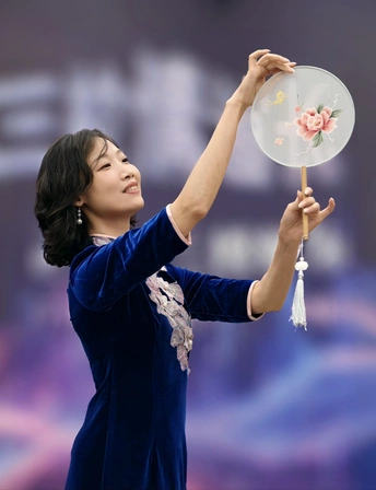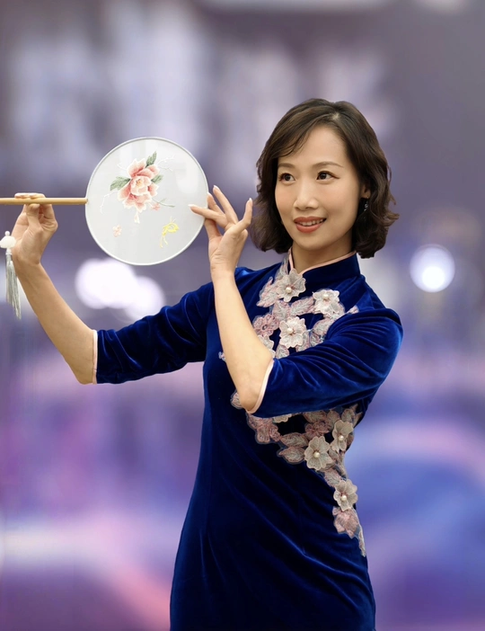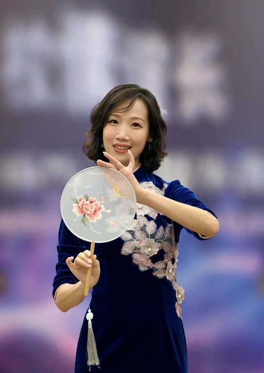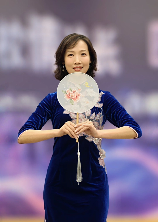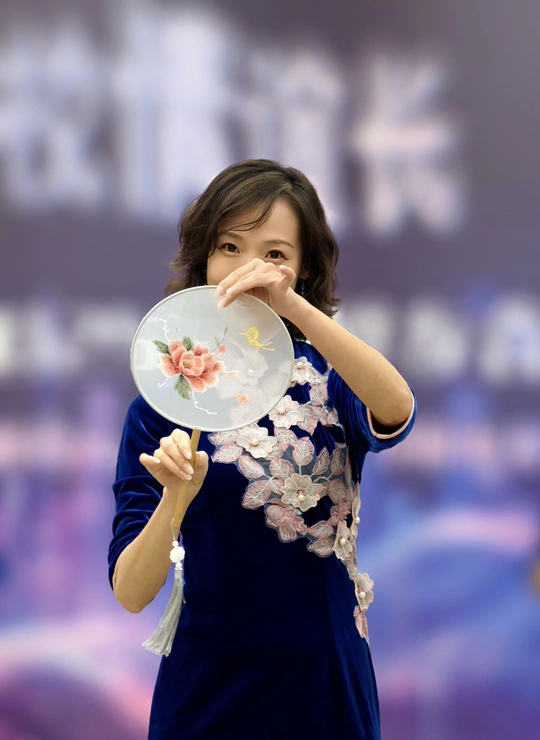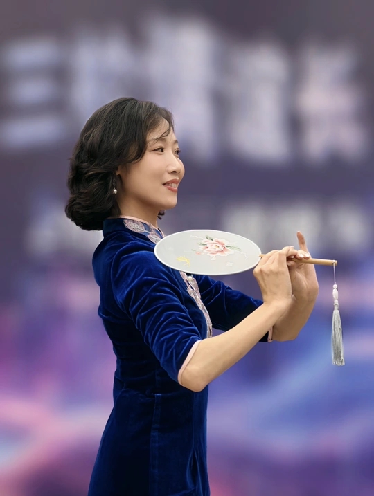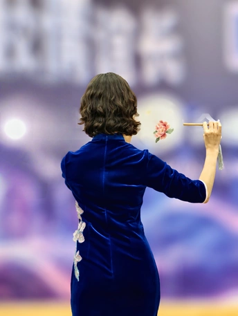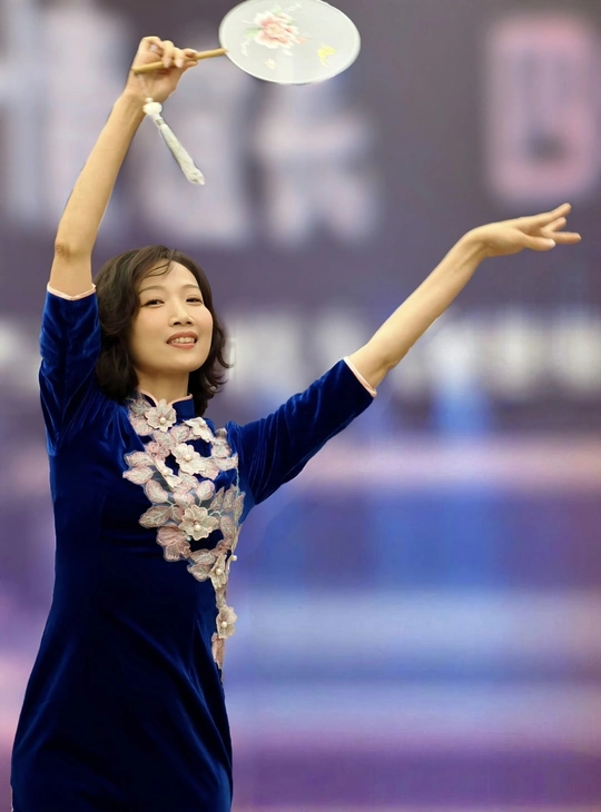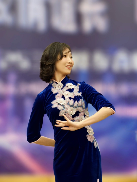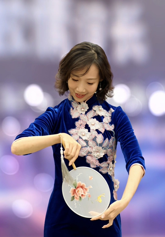 三校联欢会上,她身着一袭深蓝旗袍款款登台。流畅的剪裁勾勒出东方女性的柔美曲线,手持团扇轻摇,传统元素与诗意在举手投足间完美交融。每一次转身、每一个颔首,都将中式美学的温婉灵动展现得淋漓尽致,于流光溢彩的舞台之上,诠释着独属于东方的优雅风情。