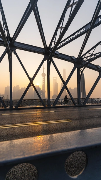 早上的外滩,行人骑着自行车,金色的阳光洒在外白渡桥和外滩的高楼大厦里