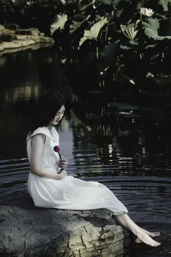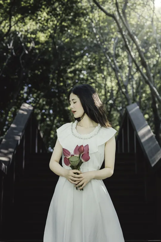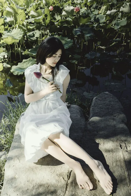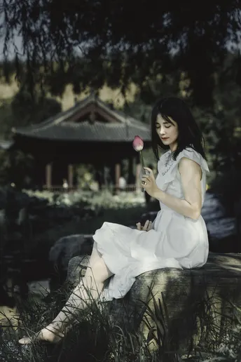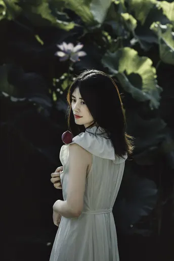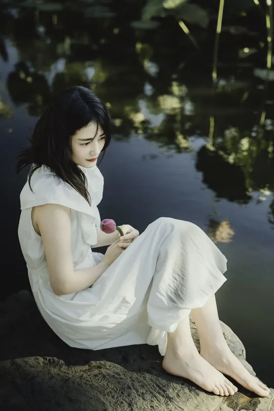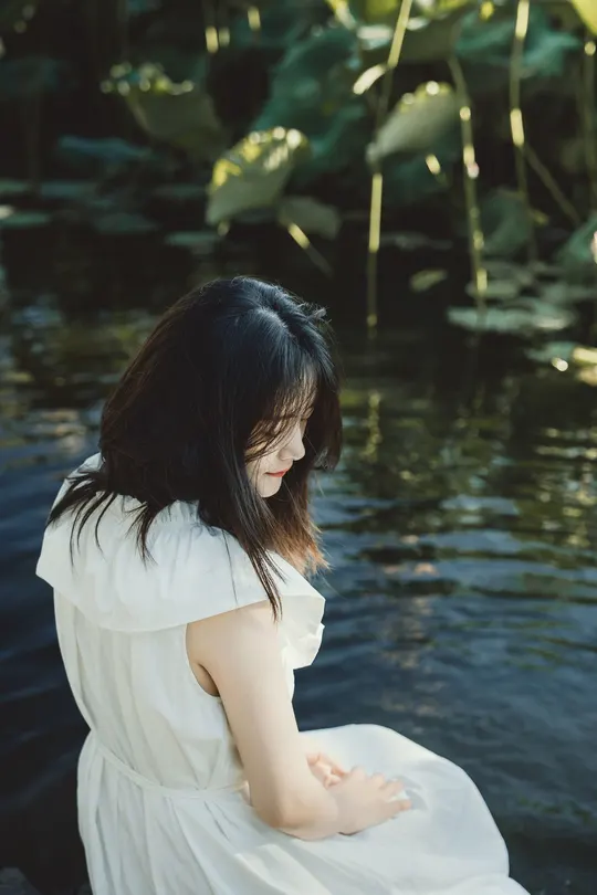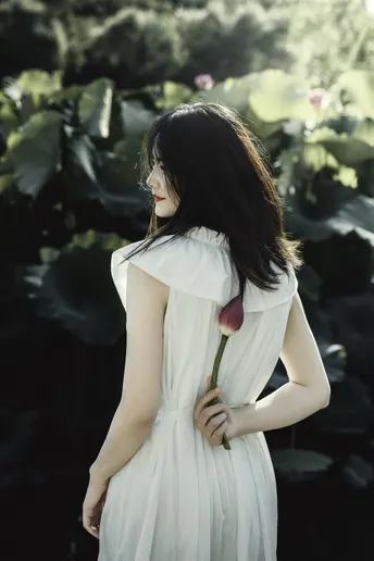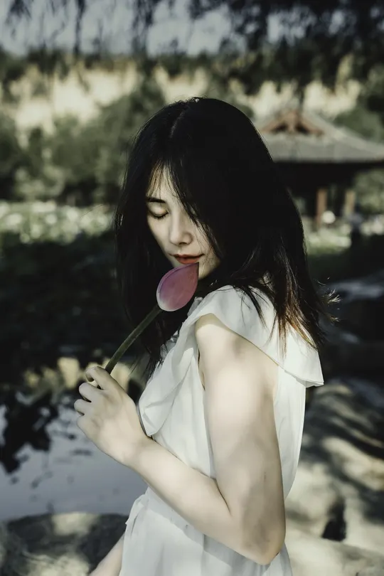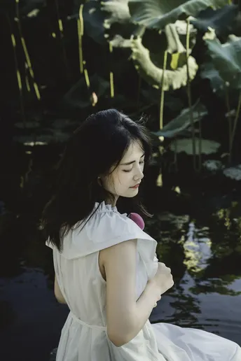 一池碧叶初展,夏意渐深。 素衣女子静坐水畔,执一枝未绽荷。光影筛过枝叶,斑驳落于肩头,似时光凝驻的温柔。 风起,裙裾轻扬,荷香暗浮,宛若江南水墨中人,携细语低眉的心事,与夏风私语。 有些画面,不必言明;有些心绪,只在风中。倚花,临水,一念一动皆成静好。 若言夏日最动人处,恰是这无声一瞬——白衣如雪,莲未全开,风动心漪,荷影留香。